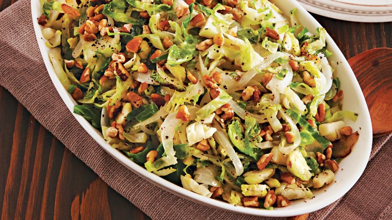 Melt butter in large heavy skillet over medium-high heat: add pecans and sauté 5 min. or until toasted. Revove pecans from skillet. Add onions, and cook, stirring often, 15 min. or until caramel colored. Add pecans and Brussels sprouts and cook about 3 minuets or until heated. Sprinkle with salt and pepper.