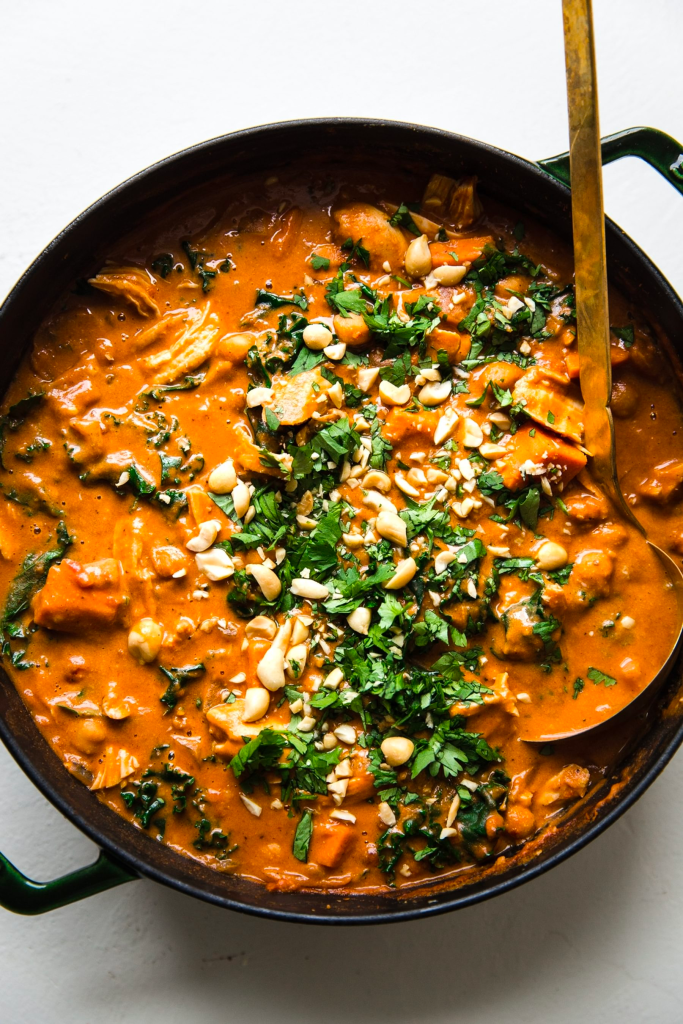 - Add in kale and shredded chicken and cook for another 5 minutes. Taste the soup before adding salt. Depending on how salty your stock and/or peanut butter was, it may not need anymore salt. If you use low sodium stock and salt-free peanut butter, it will need a full teaspoon salt, maybe more. Adjust to your own liking.